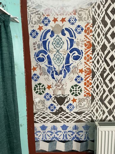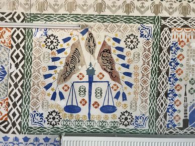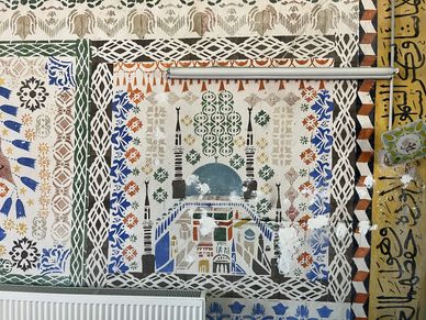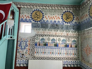 Caminin harim duvarlarının hepsi kalemişi bezemelerle süslenmiştir. Yapıda yer alan kalemişi süslemlerde cami, bitki,halı, mihrap, terazi, ibrik gibi motifler yer almaktadır.