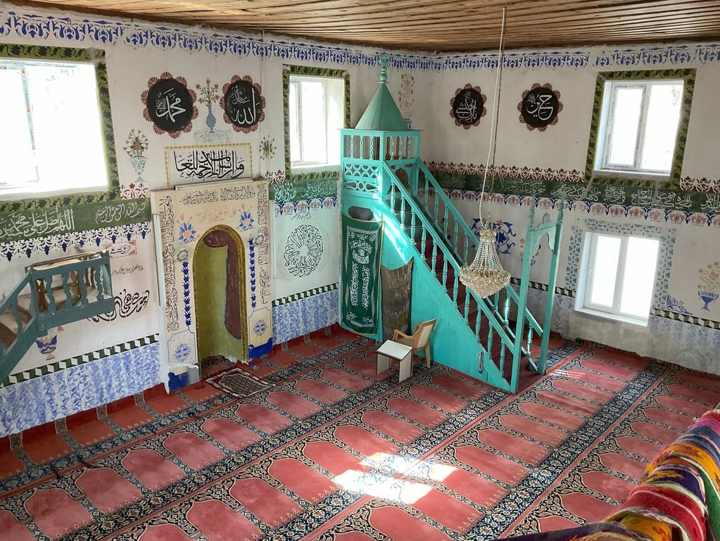 Caminin harim duvarları ve dış cephesinin kuzey duvarı kalemişi süslemelerle bezenmiştir. Bitkisel motifler, perde, ibrik motifi gibi süslemeler duvarlarda konumlanmıştır. Bu motiflerin yanısıra hat yazıtları da duvarlarda kendine yer bulmuştur.