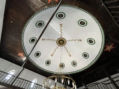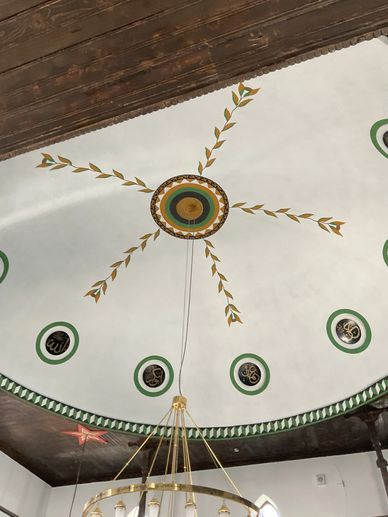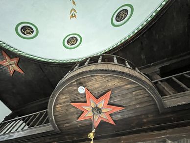 Yapının harimi dikdörtgen planlıdır ve ahşap tavandan yükselen bir kubbeye sahiptir. Kubbenin eteklerinde siyah, yeşil ve beyaz zikzak desenleri, içinde ise siyah zemin üzerine sarı yazılı ve yeşil daire içine alınmış madalyonlar bulunur. Kubbenin ortasında iç içe geçmiş daireler, üçgen kuşaklar ve bitkisel motiflerle zengin bir süsleme yer alır. Tavanın kubbe dışındaki kısımlarında pembe-sarı renklere boyanmış ahşap altı kollu yıldız motifleri, kadınlar mahfilinin hemen altında ise ahşap yedi kollu yıldız süslemesi dikkat çeker. Caminin dikkat çekici bir başka yanı ise tavanındaki hat yazısı ile yazılmış ay yıldız tasviridir.