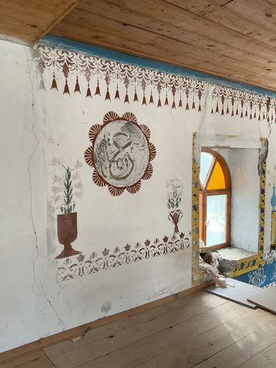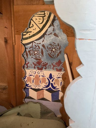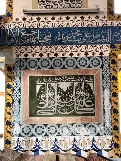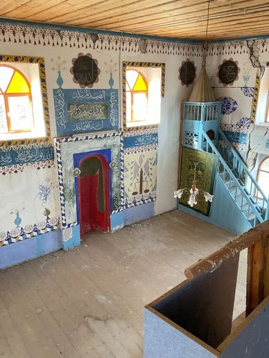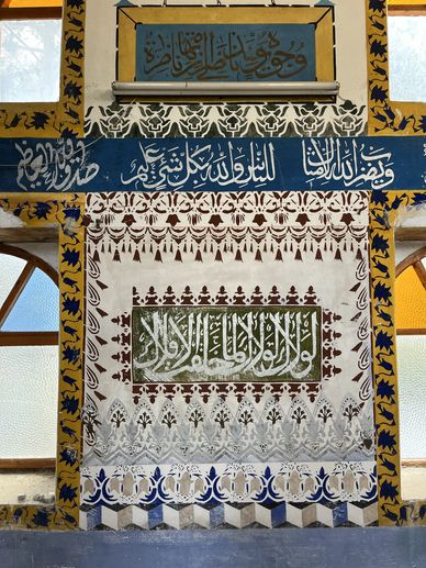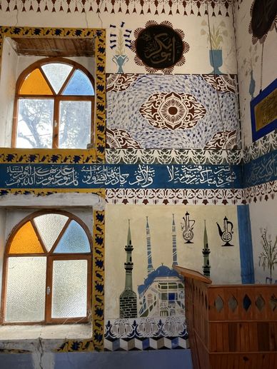 Duvarlarda yeşil, açık-koyu mavi, kırmızı,, pembe, sarı ve krem gibi canlı renkler kullanılmıştır. Caminin yapımı sırasında kök boyaların parlaklığını arttırmak için süt kullanıldığı bilinmektedir. Duvarlar süslemeleri; sancak, kabe, mizan terazisi, halı, ibrik, perde gibi motifleerden ve hat yazıtlarından oluşmaktadır.